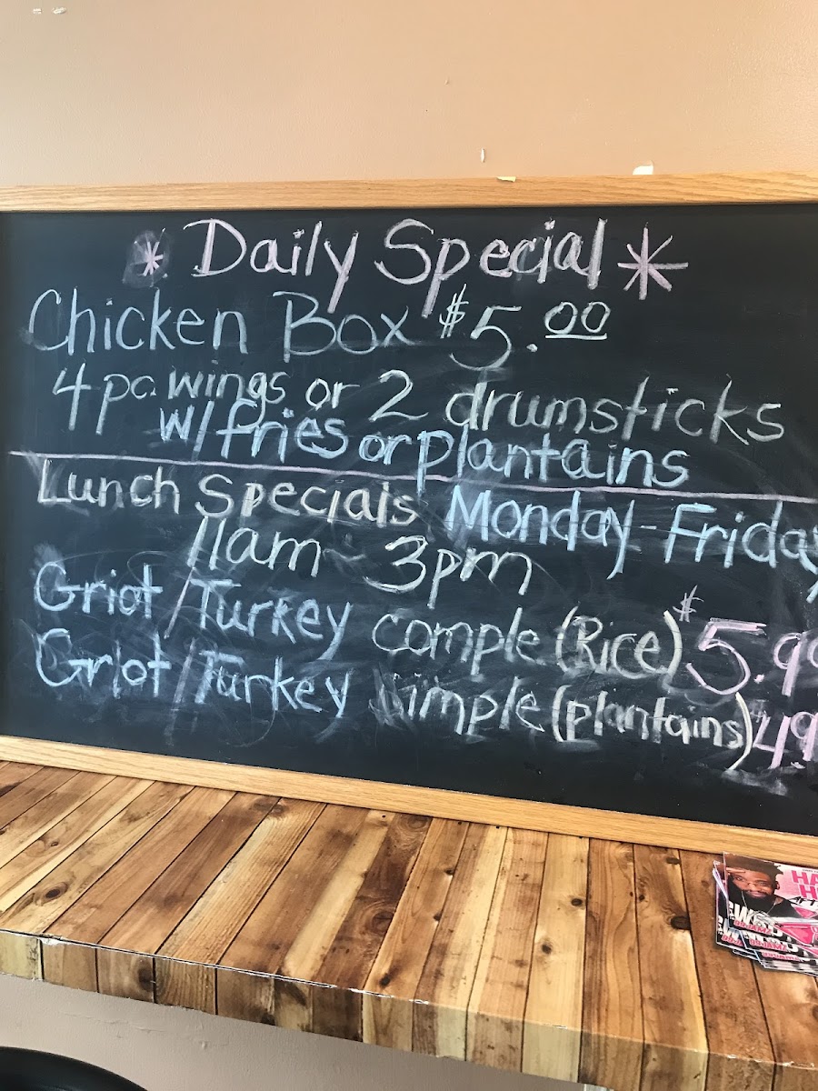 Dinner-Comple Means this meal only comes with the above listed meat and the following: Plantains, Rice, Pikles(Haitian hot Sauce: a savory taste of hot peppers, vinegar and cabbage), Gravy Sauce, Onions and Salad.